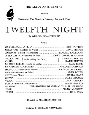 Leeds Arts Centre performed Twelfth Night in March – April 1966.